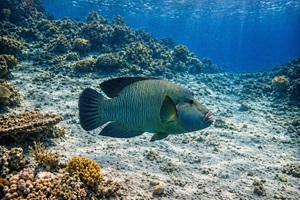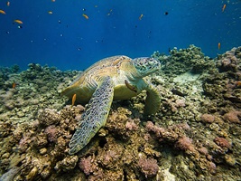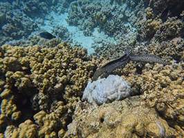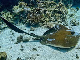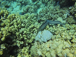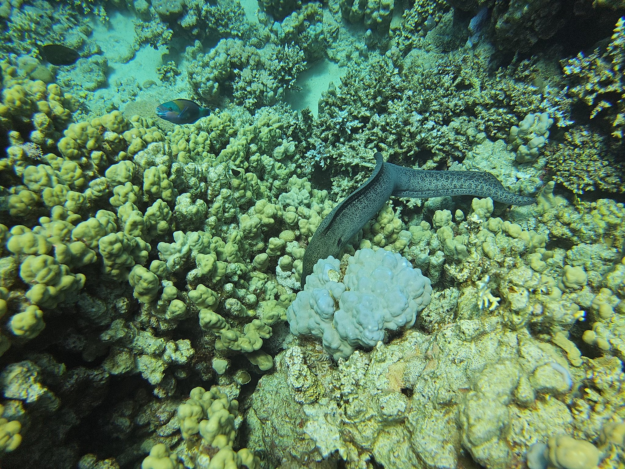 An Fisch gab’s eigentlich alles, was man sich für das Rote Meer wünscht: Muränen, Blaupunktrochen, Napoleon-Lippfische, grüne Meeresschildkröten, Stachelrochen, Adlerrochen, Riesen-Kugelfische und natürlich jede Menge bunte Rifffische. Wir hatten etwas Glück, denn auch Delfine gaben sich die Ehre.